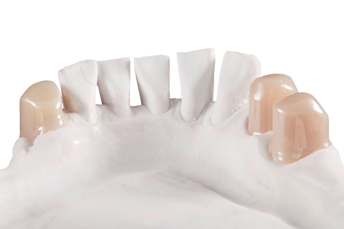 Eine Kombination aus Zirkoniumdioxid-Primärkronen und PEEK-Sekundärkronen